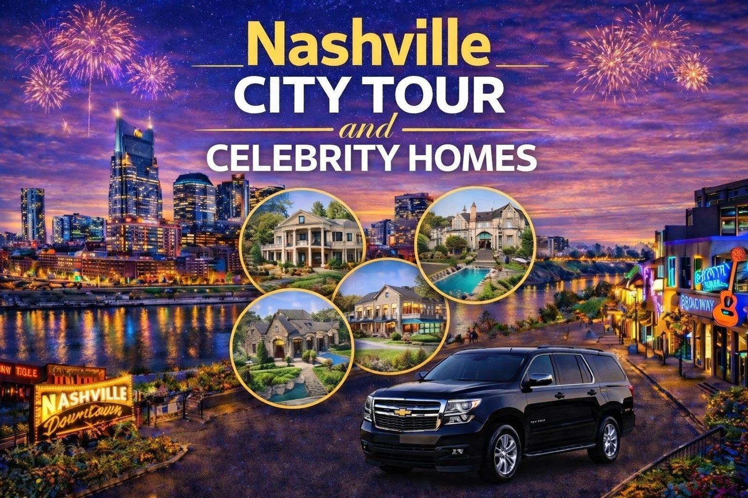 A private Nashville city and celebrity homes tour offers an exclusive, crowd-free way to experience Music City. Ride in comfort as your guide shares insider stories, explore from Lower Broadway to gated estates, and enjoy time for photos, and shopping in The Gulch and 12th Ave South—all at your own pace. (4 Hours)